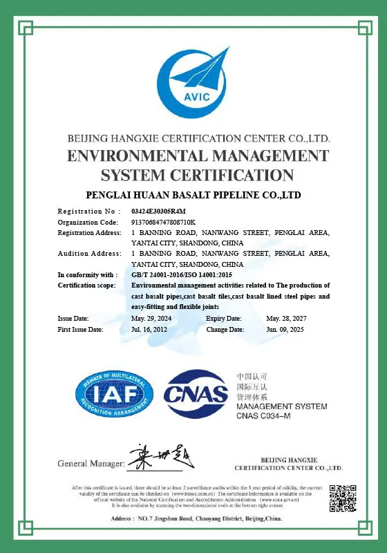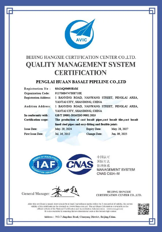 ООО Пэнлай Хуаань Фитинги Из Каменного Литья было основано в 2003 году с использованием передовых для того времени международных технологий производства каменного литья. Была запущена полная производственная линия базальтового каменного литья — от центробежного литья расплава, кристаллизации и отжига до механической обработки готовых изделий — с годовой производственной мощностью до 9000 тонн.